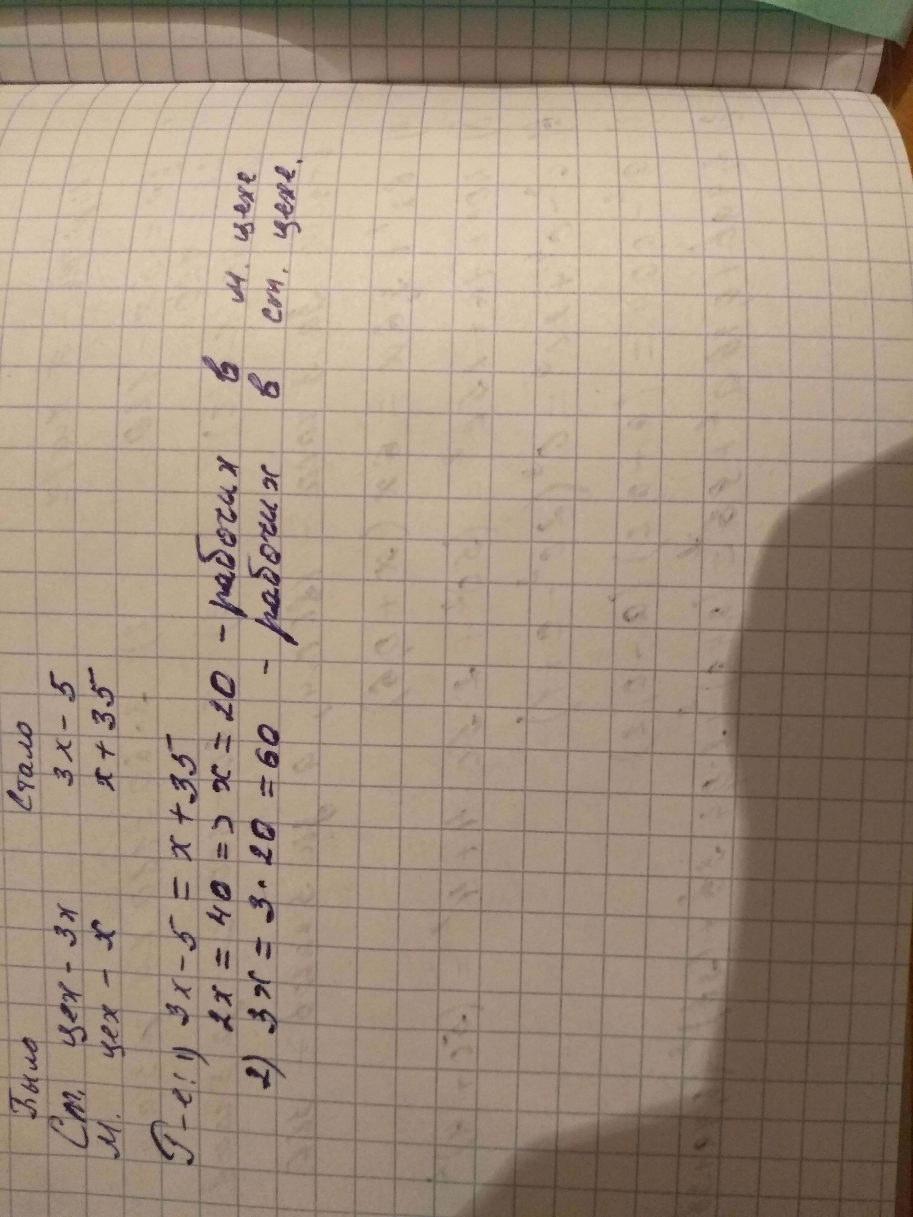 в сталелитейном цехе в 3 раза больше рабочих чем в модельном когда из столетий назад ушло 5 человек то в модельный цех пришло 35, то в цехах стало поровну. Сколько рабочих было в каждом цехе?