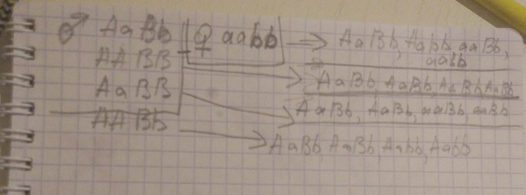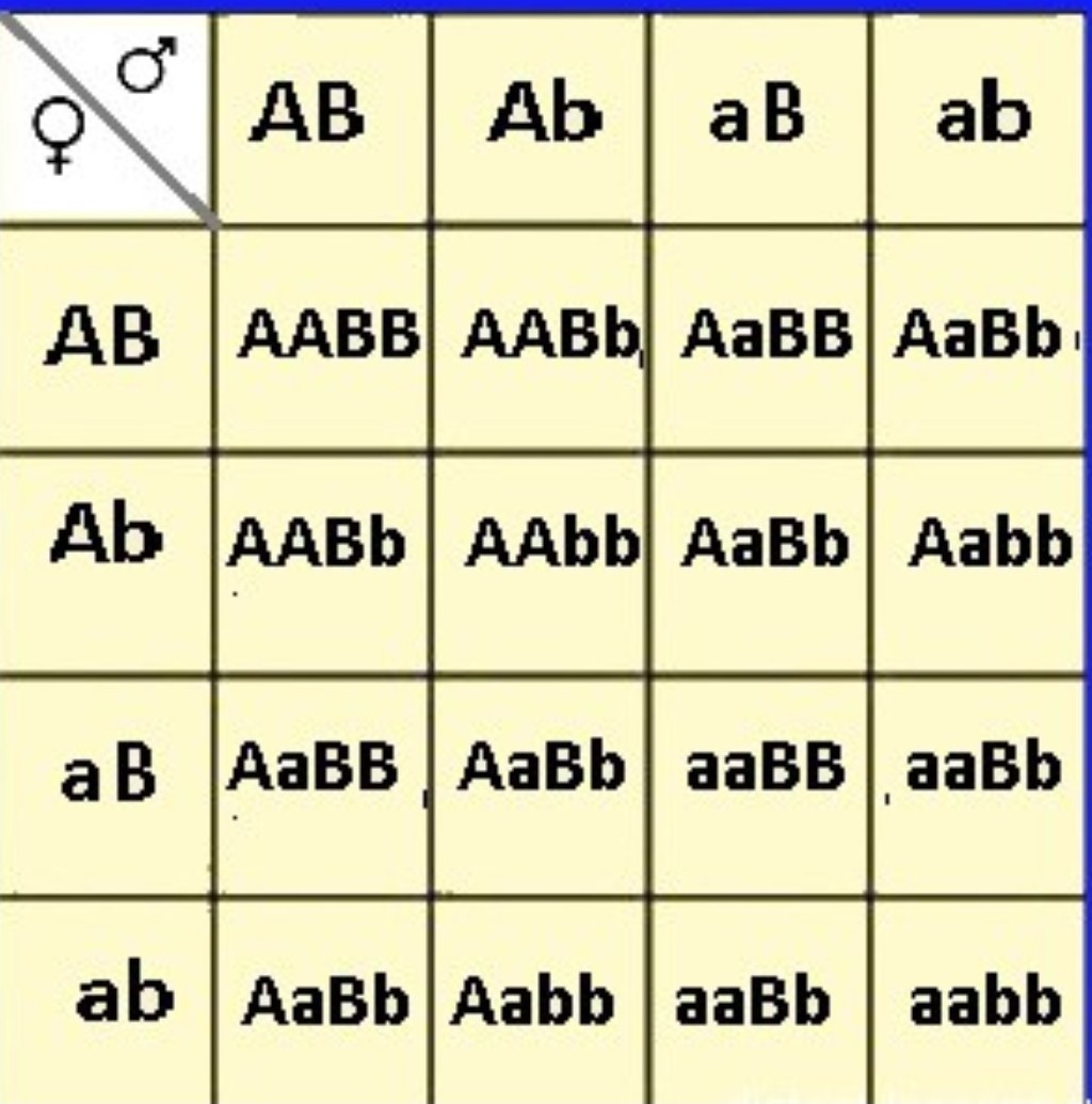 При скрещивании получается такая таблица, как на фото. То есть 9 из гибридов будут обладать признаками нормального роста и раннеспелости, 3 нормального роста и позднеспелости, 3 гигантизма и раннеспелости и 1 гигантизма и позднеспелости.