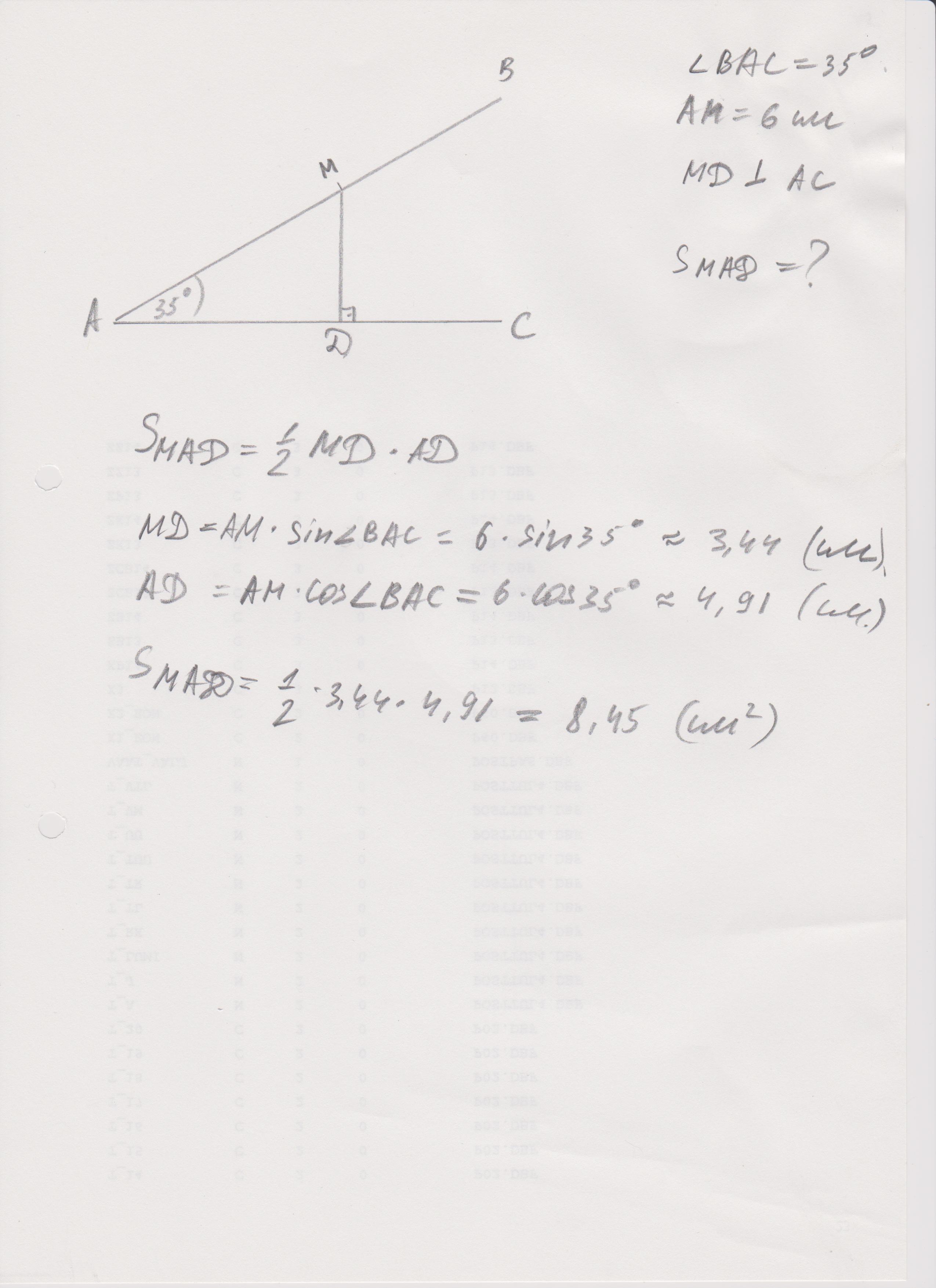Постройте с помощью транспортира угол BAC, равный 35°, и отложите на луче AB отрезок AM длиной 6 см. Используя угольник, проведите через точку M прямую перпендикулярную AC и найдите площадь образовавшегося треугольника (в см2).