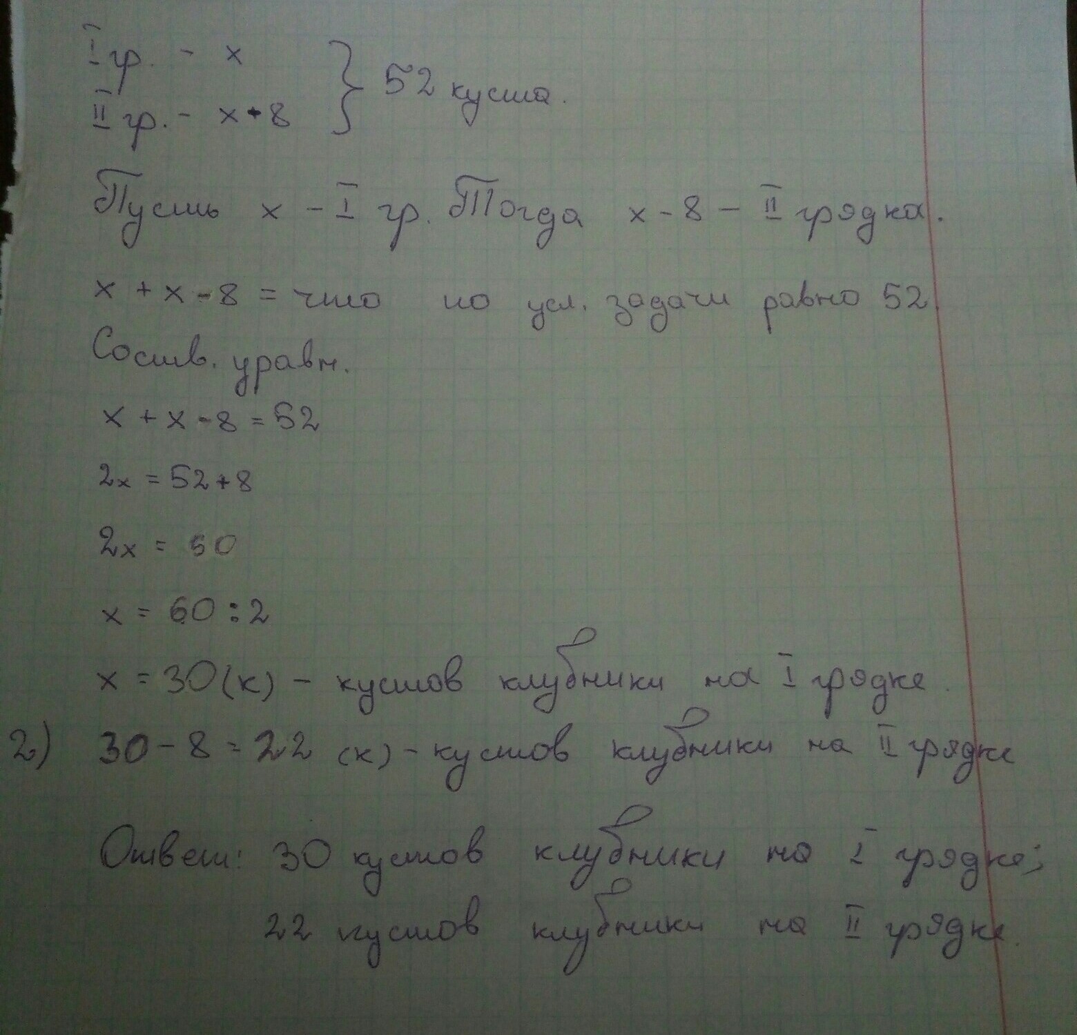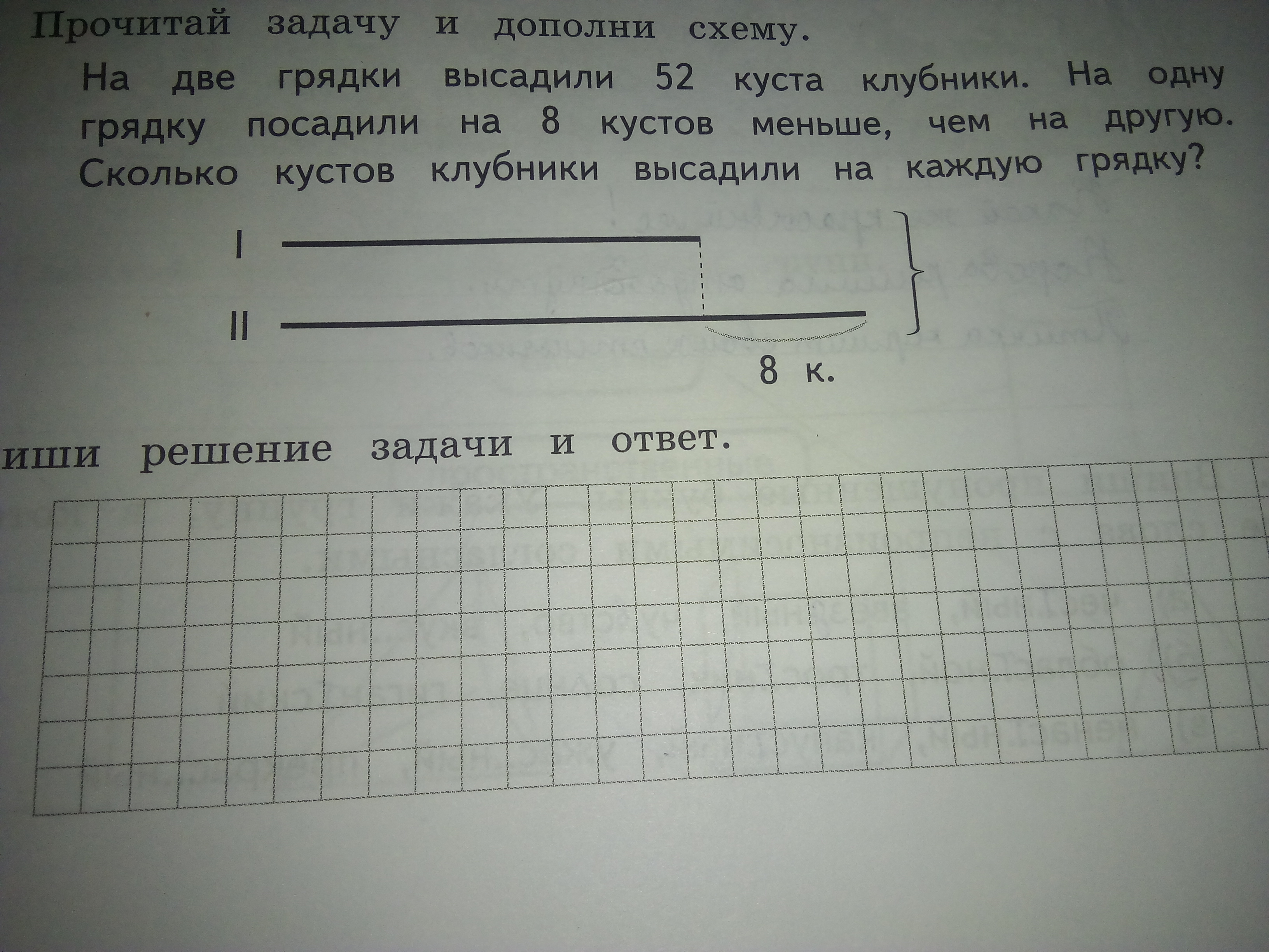Помогите пожалуйста задача. Прочитай задачу и дополни схему. На две грядки висадили 52 куста клубники. На одну грядку посадили на 8 кустов меньше,чем на другую. Сколько кустов клубники высадили на каждую грядку.