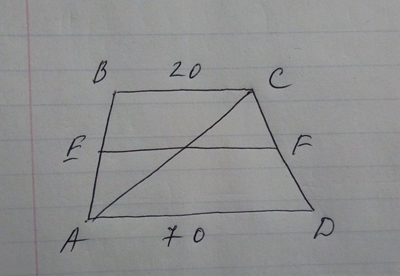 BC=20 и AD=70 проведена прямая , параллельная основаниям трапеции и пересекающая боковые ребра AB и CD соответственно в точках E и F. Найдите EF, если CF:FD=2:3.