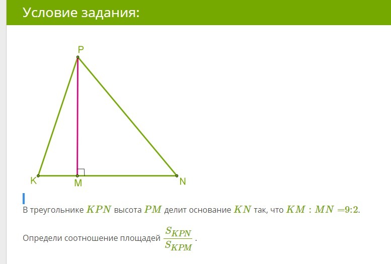 В треугольнике KPN высота PM делит основание KN так, что KM:MN=9:2.
