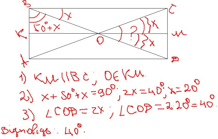 Діагональ прямокутника ділить його кут на два кути, різниця яких дорівнює 50 градусів. Знайдіть кут між діагоналями даного прямокутника