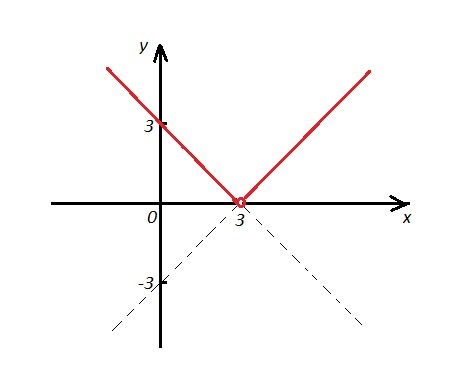 Cтроим прямую у=х-3 при x>3 и у=3-х при х<3, причём при х=3 функция не определена. Поэтому из графика выколем точку (3,0).