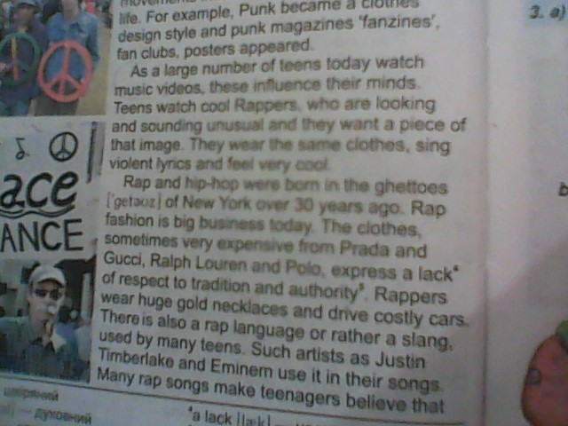 меня например, панк стал стиль дизайна одежды и панк-журналы фэнзинов, фан-клубы, появились плакаты.Как большое количество подростков сегодня смотреть музыкальные видео, они влияют на их умы, подростки смотреть здорово рэпперов, которые смотрят и звучание авторские, и они хотят кусок thait изображения.Они носить же одежду, петь насильственных lyriocs и корма очень здорово.Рэп и хип-хоп родились в гетто Нью-Йорке более 30 лет назад. Рэп мода сегодня это большой бизнес. Одежда, иногда очень expentive от Prada и Cucci, Ральф Louren и поло, Экспресс отсутствие уважения к традиции и власть. Рэперы носить огромные золотые ожерелья и водить автомобили и дорогостоящим.Существует также рэп язык или скорее сленг, используемый многие подростки. Такие исполнители, как Джастин Тимберлейк и Eminern использовать его в своих песнях.Многие рэп песни сделать подростков считают, что