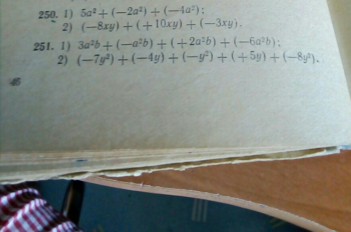 251.1. 3a^2b + (-a^2b) + (+2a^2b) + (-6a^2b) = 3a^2b -a^2b + 2a^2b - 6a^2b = a^2b (3-1+2-6) = -2a^2b