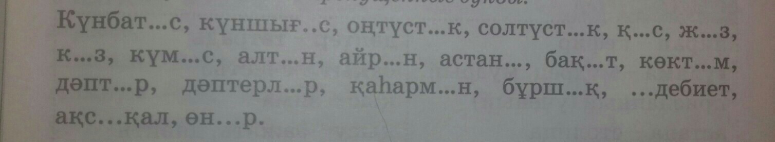 күнбатыс, күншығыс, оңтүстік, солтүстік, қыс, жаз, күз, күміс, алтын, айран, астана, бақыт, көктем, дəптер, дəптерлер, қаһарман, бұршақ, əдебиет, ақсақал, өнер.
