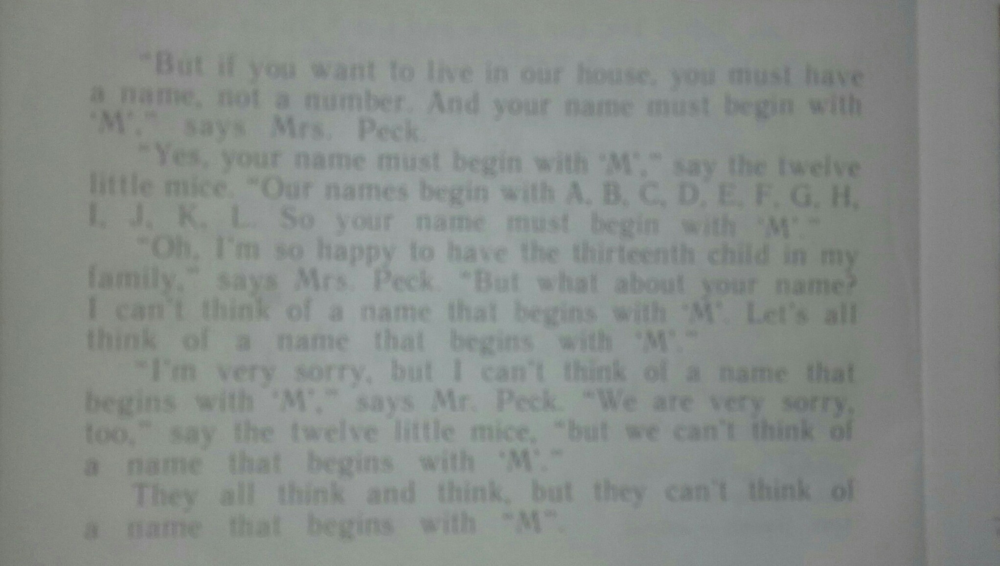 Да твоё имя должно начинаться с М сказал двенадцатый маленький мышонок наши имена начинаются с abcdfgh