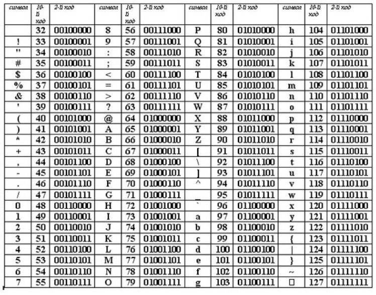 таблица знаков в формате двоичного кода