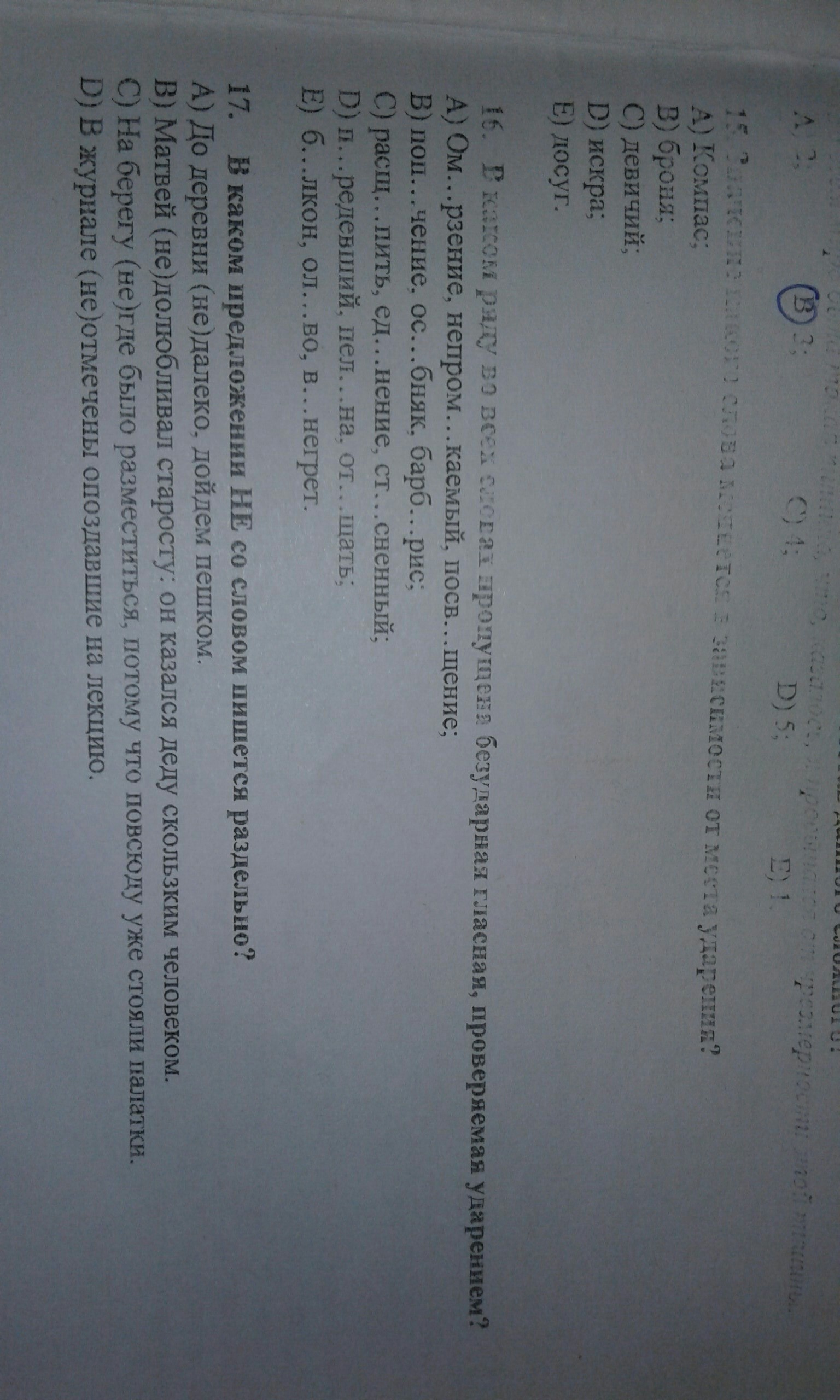 15 - В) броня' (Бро'ня-имя)...16 - А) ОмЕрзение (ме'рзость), непромОкаемый (мо'кнуть), посвЯщение (свя'тость)...17 - D) В журнале не отмечены опоздавшие на лекцию.