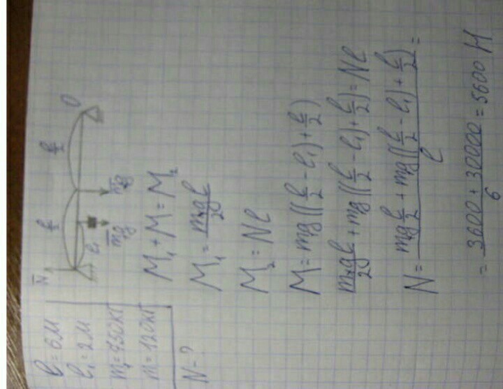 Однородная балка длиной 6 м своими концами опирается на две опоры. К балке на расстоянии 2 м от правого конца подвешен груз массой m = 750 кг (рис. ). Масса балки 120 кг. С какой силой давит балка с грузом на правую опору? По правилу моментов.