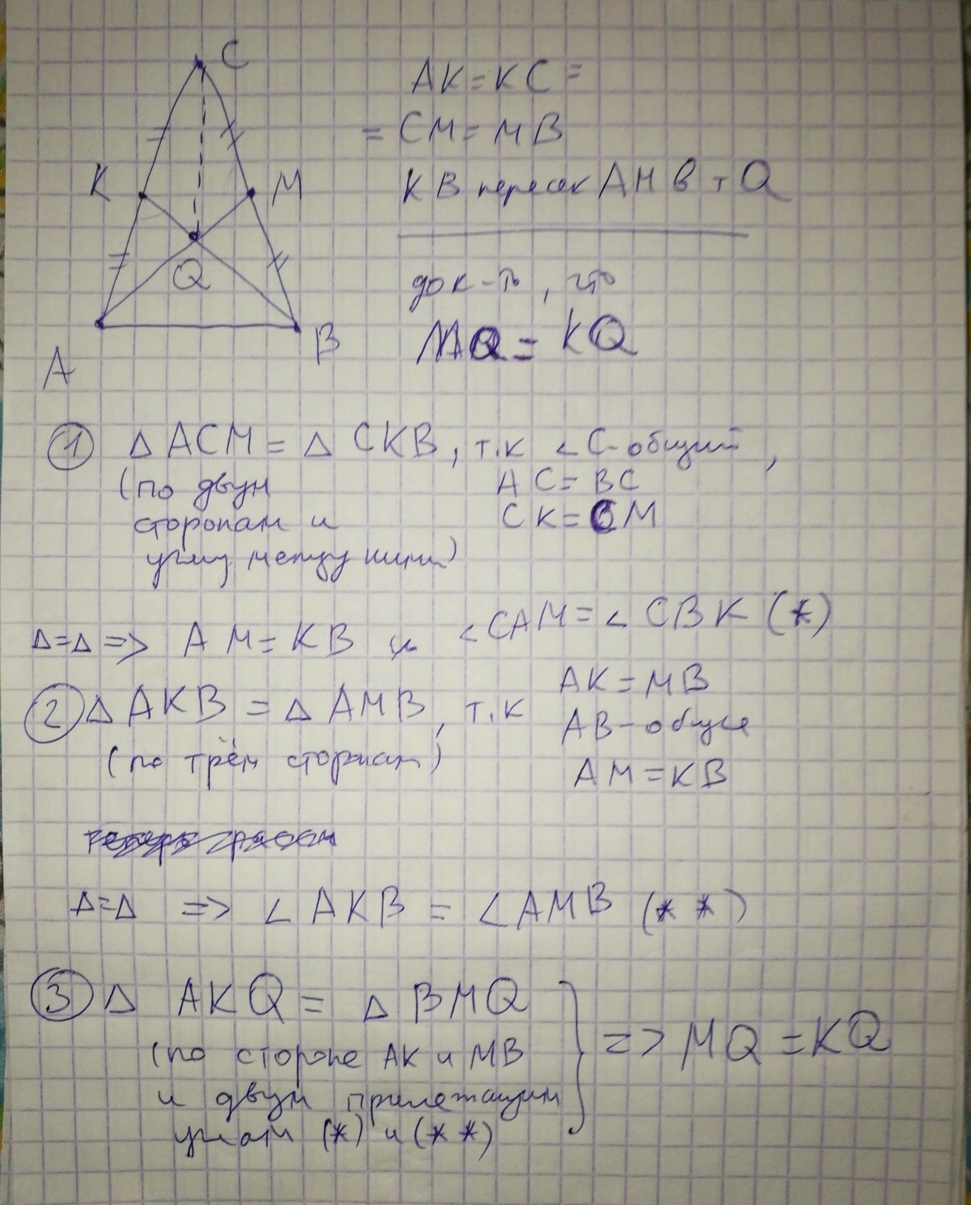 Точки K и M являются соответственно серединами боковых сторон AC и BC равнобедренного треугольника ABC. Докажите что MQ=KQ где Q точка пересечения AM и BK