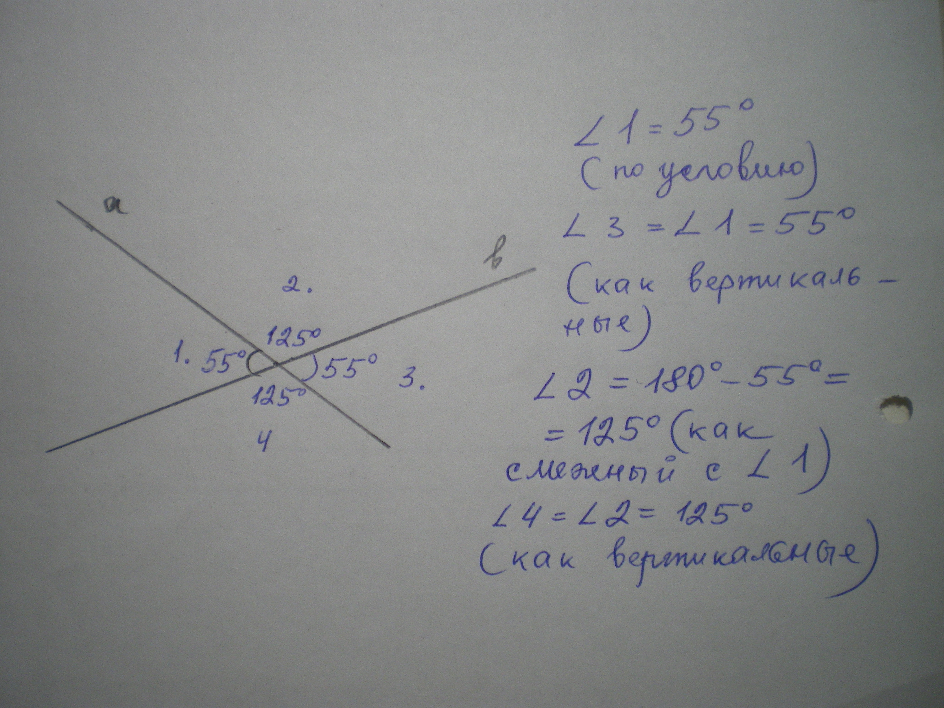 Начертите прямые а и б если известно что один из углов образовавшихся при их пересечении равен 55 запиши величины трех других углов