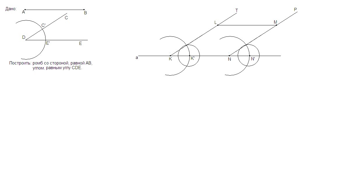 2. Построим ∠TKN = ∠PNN' = ∠CDE. Для этого проведем дугу произвольного одинакового радиуса с центрами в точках D, К и N.