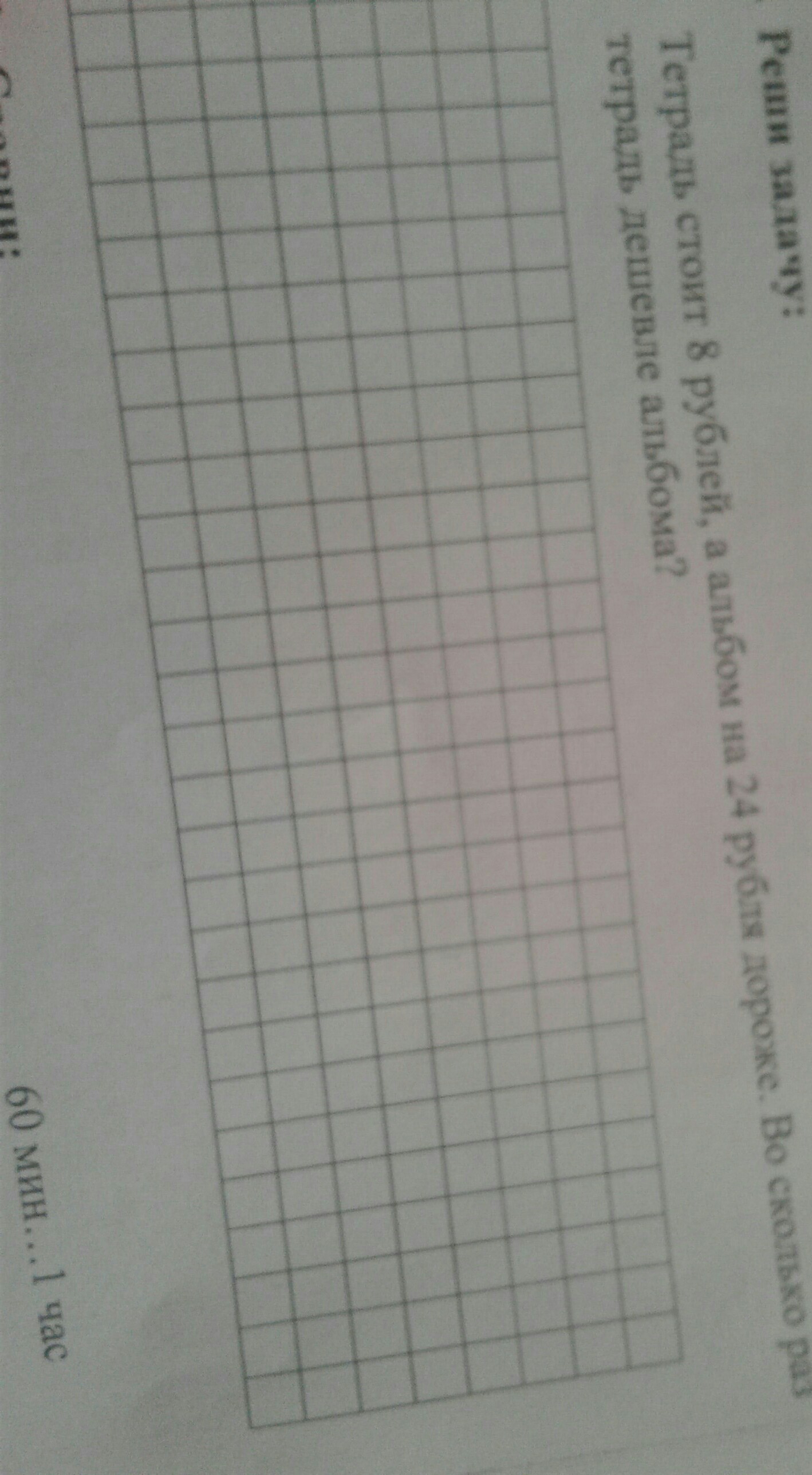Решение: 1) 8+24=32 (руб)-стоимость альбома; 2) 32:8=4 (раза). Ответ: Тетрадь дешевле альбома в 4 раза.