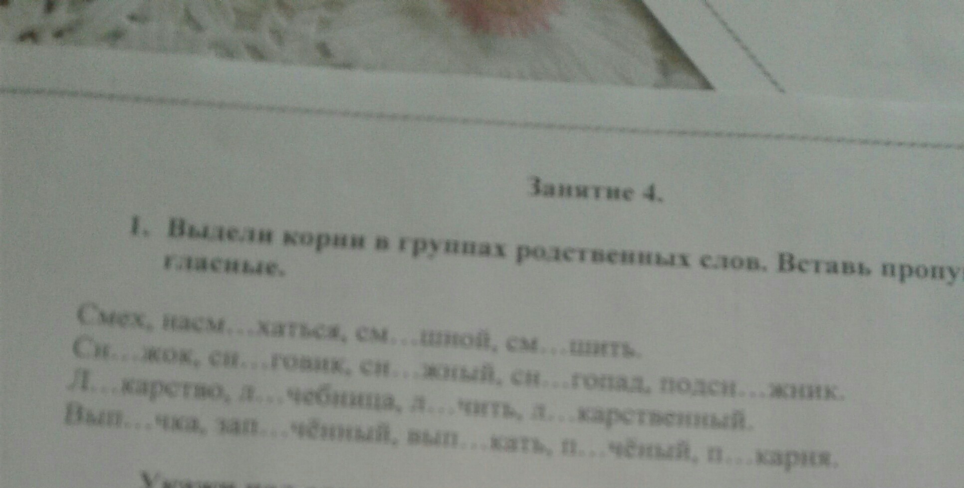 СМЕХ, наСМЕХаться, СМЕШной, СМЕШить...СНЕЖок, СНЕГовик, СНЕЖный, СНЕГопад, подСНЕЖник...ЛЕКарство, ЛЕЧебница, ЛЕЧить, ЛЕКарственный...выПЕЧка, заПЕЧённый, выПЕКать, ПЕЧёный, ПЕКарня.