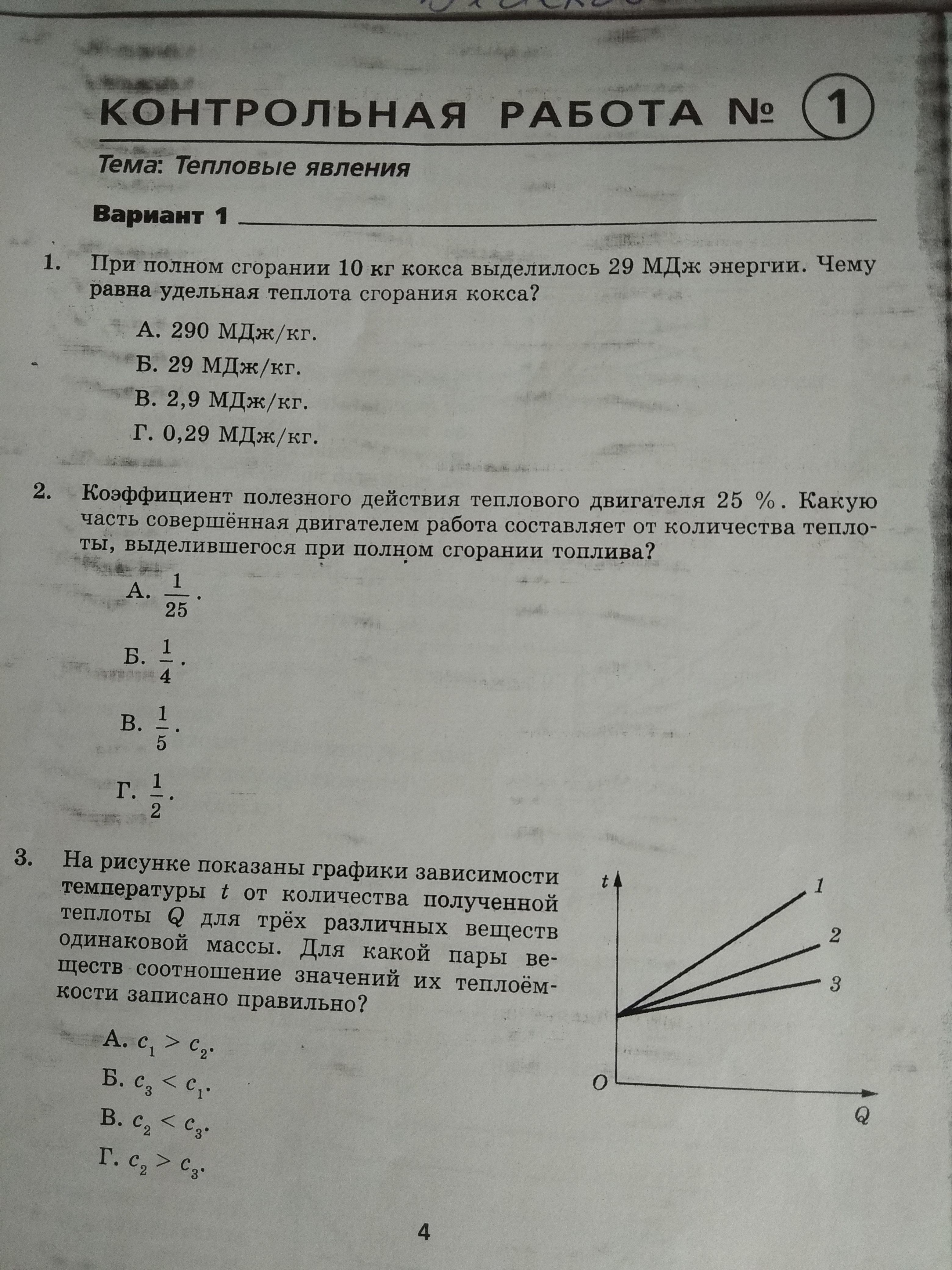 №1. уд. теплота сгорания * масса = теплота, значит удельная теплота сгорания равна теплоте деленной на массу. Это 29 МДж/10 = 2.9 МДж/кг (В)