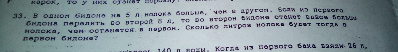 Пусть х л было в первом бидоне, тогда во втором х-5л. По условию задачи составим уравнение:
