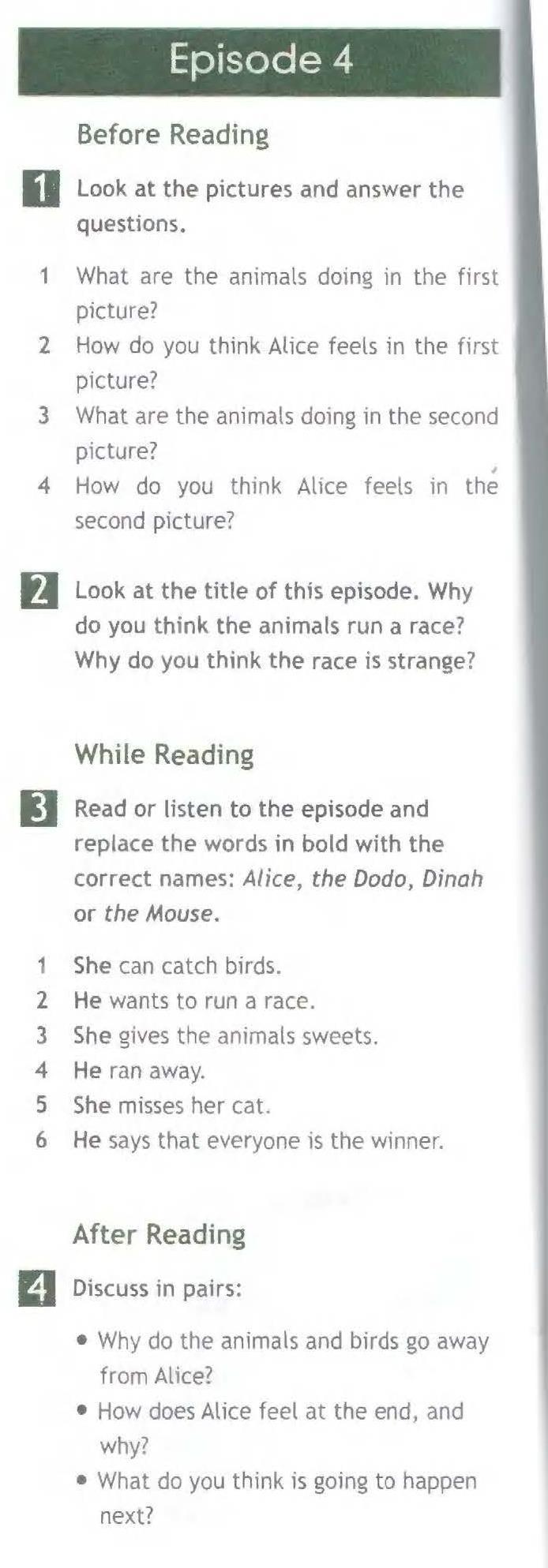 3. Прочтите или прослушайте эпизод и замените выделенные жирным шрифтом слова корректными именами: Алиса, Додо, Дина или Мышонок.