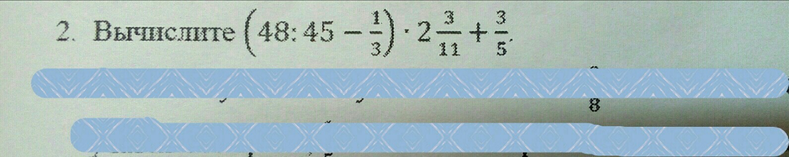 (48÷45-1/3)×2 целых 3/11+3/5= 2 целых 4/15