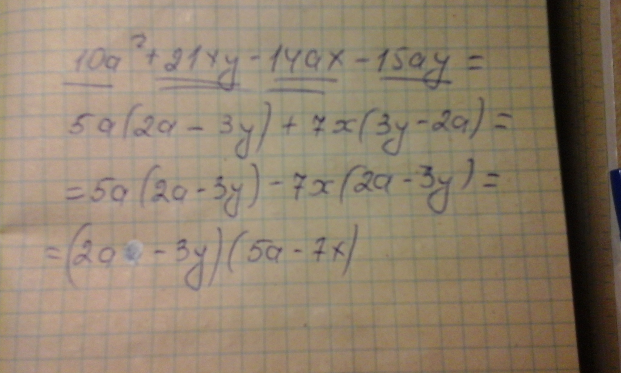 10a² + 21xy - 14ax - 15ay = (10a² - 14ax) - (15ay - 21xy) = 2a·(5a - 7x) - 3y·(5a - 7x) = (5a - 7x)(2a - 3y)