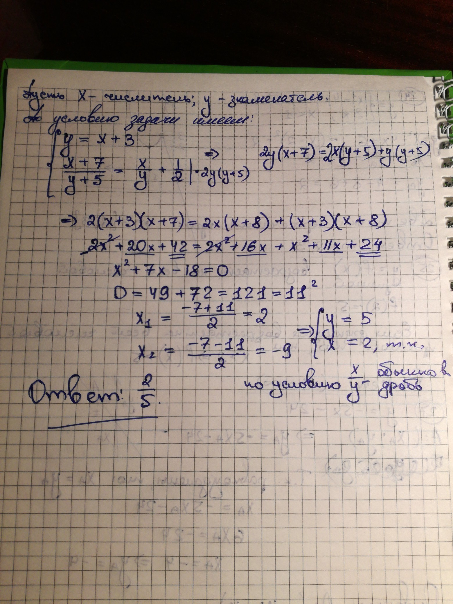 Знаменатель обычной дроби больше его числителя на 3. Если к числителю этой дроби добавить 7,а к знаменателю 5, то данная дробь увеличится на одну вторую(0.5).Найти эту дробь