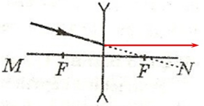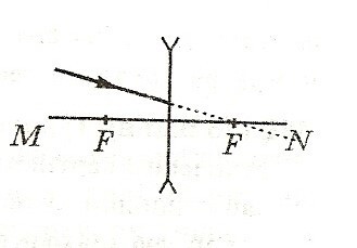 Згідно закону оборотності ходу променів, виходячи з даних малюнка, можна зрозуміти, що промінь заломлений буде поширюватись паралельно головній оптичній осі.