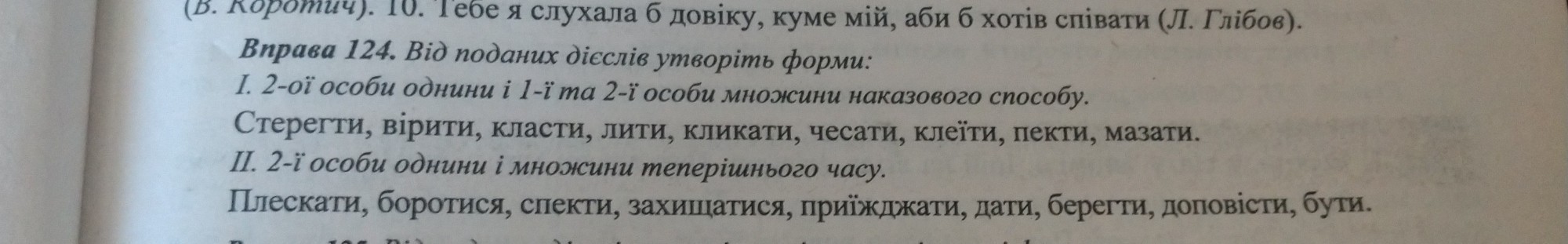 1. Стережи, стережімо, стережіть; вір, вірмо, вірте; клади, кладімо, кладіть; лий, лиймо, лийте; клич, кличмо, кличте; чеши, чешімо, чешіть; клей, клеймо, клейте; печи, печімо, печіть; маж, мажмо, мажте.