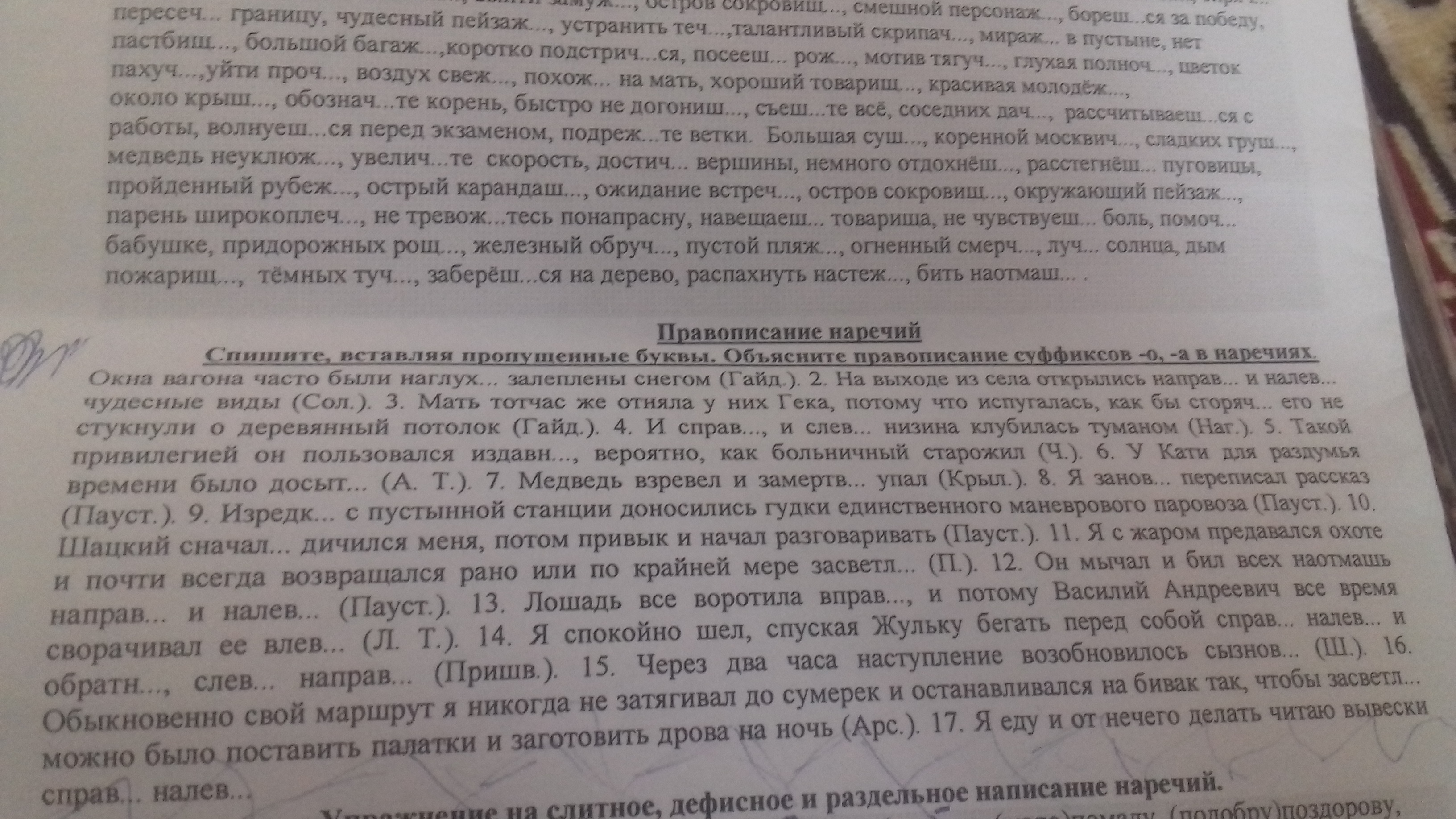 1.Окна вагона часто были наглухО залеплены снегом. 2.На выходе из села открылись направО и налевО чудесные виды. 3.Мать тотчас же отняла у них Гека,потому что испугалась,как бы сгорячА его не стукнули о деревянный потолок. 4.И справА,и слевА низина клубилась туманом. 5.Такой привилегией он пользовался издавнА,вероятно,как больничный старожил. 6.У Кати для раздумья времени было досытА. 7.Медведь взревел и замертвО упал. 8.Я зановО переписал рассказ. 9.ИзредкА с пустынной станции доносились гудки единственного маневрового паровоза. 10.Шацкий сначалА дичился меня,потом привык и начал разговаривать. 11.Я с жаром предавался охоте и почти всегда возвращался рано или по крайней мере засветлО. 12.Он мычал и бил всех наотмашь направО и налевО. 13.Лошадь всё воротила вправО,и потому Василий Андреевич всё время сворачивал её влевО. 14.Я спокойно шёл,спуская Жульку бегать перед собой справА налевО и обратно,слевА направО. 15.Через два часа наступление возобновилось сызновА. 16.Обыкновенно свой маршрут я не затягивал до сумерек и останавливался на бивак так,чтобы засветлО можно было поставить палатки и заготовить дрова на ночь. 17.Я еду и от нечего делать читаю вывески справА налевО...В наречиях с приставками из-, до-, с- на конце пишется суффикс -а, в наречиях с приставками в-, на-, за- на пишется суффикс -о.