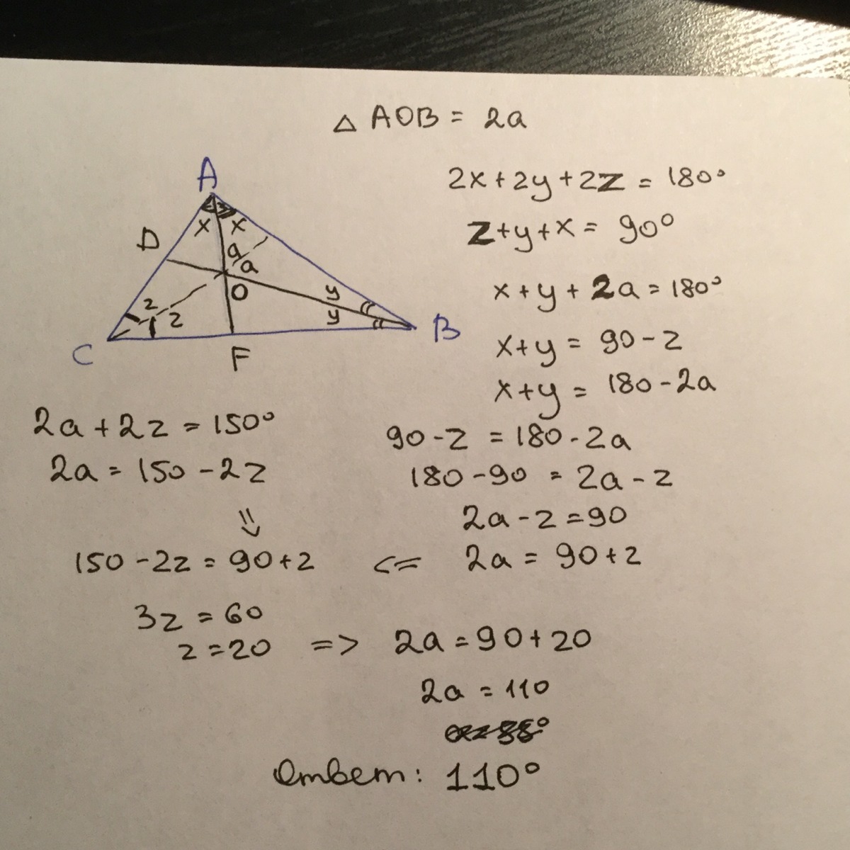 ABC треугольник. АF и BD биссектрисы и О - точка их пересечения. Угол AOB +ACB=150° Найти угол AOB