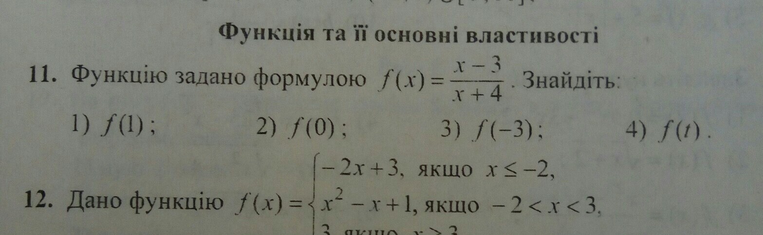 f(x) =  frac{x - 3}{x + 4}  \  \ 1) :  : f(1) =  frac{1 - 3}{1 + 4}  =  -  frac{2}{5 }  \ 2) :  : f(0) =  frac{0 - 3}{0 + 4}  =  -  frac{3}{4}  \ 3) :  : f( - 3) =  frac{ - 3 - 3}{ - 3 + 4}  =  frac{ - 6}{1}  =  - 6 \ 4) :  : f(t) =  frac{t - 3}{t + 4}