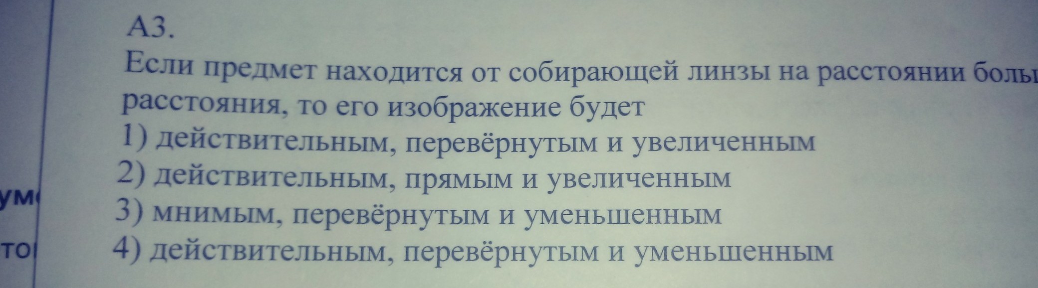 если предмет находится. от собирающей линзы на растоянии. больше двойного фокусного растояния то его изображением будет ......