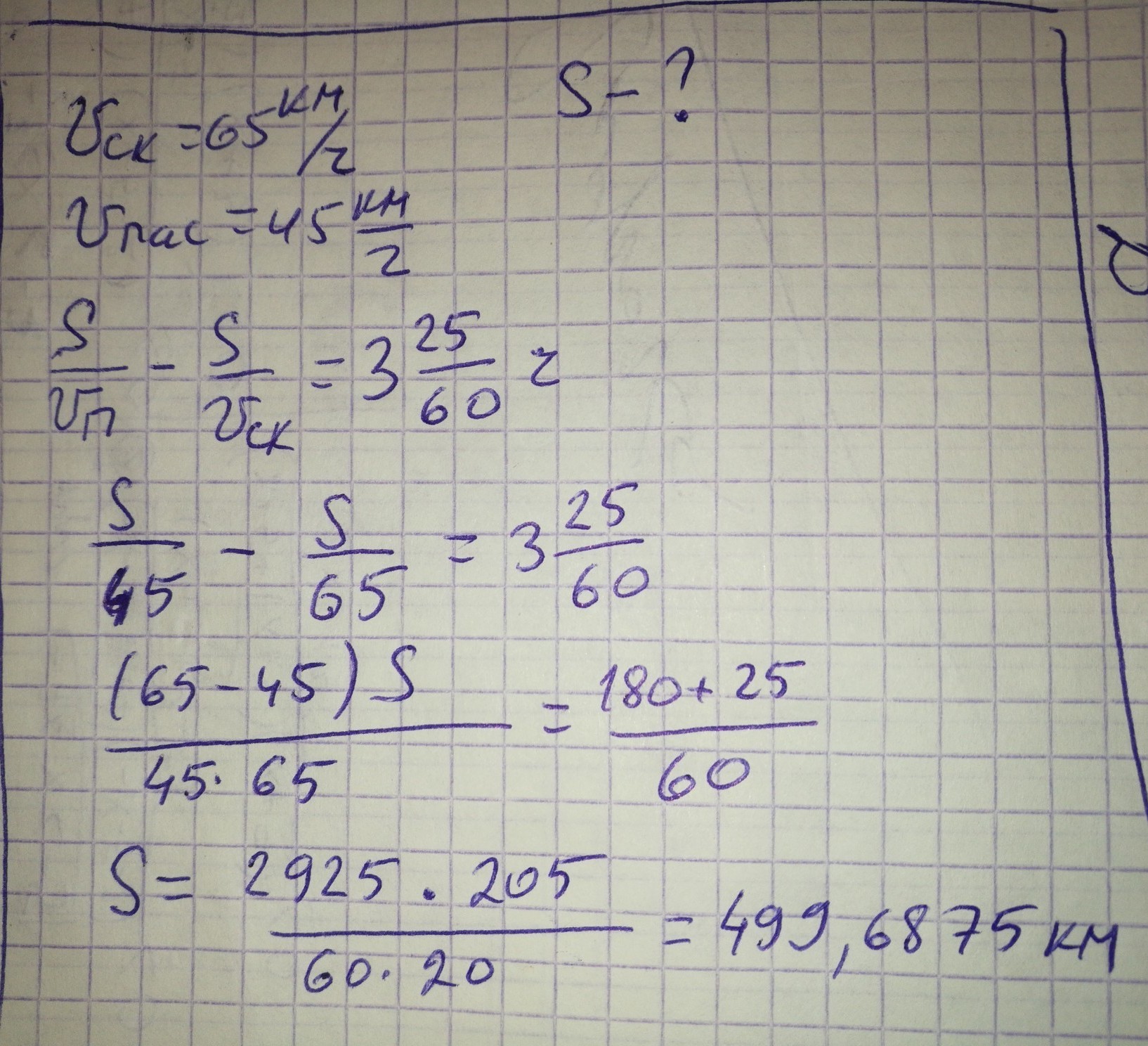 6. Скорый поезд за час проходит 65 км, а пассажирский — 45 км. Определите расстояние между двумя городами, если известно, что скорый поезд проходит это расстояние на 3 ч 25 мин быстрее пассажирского.