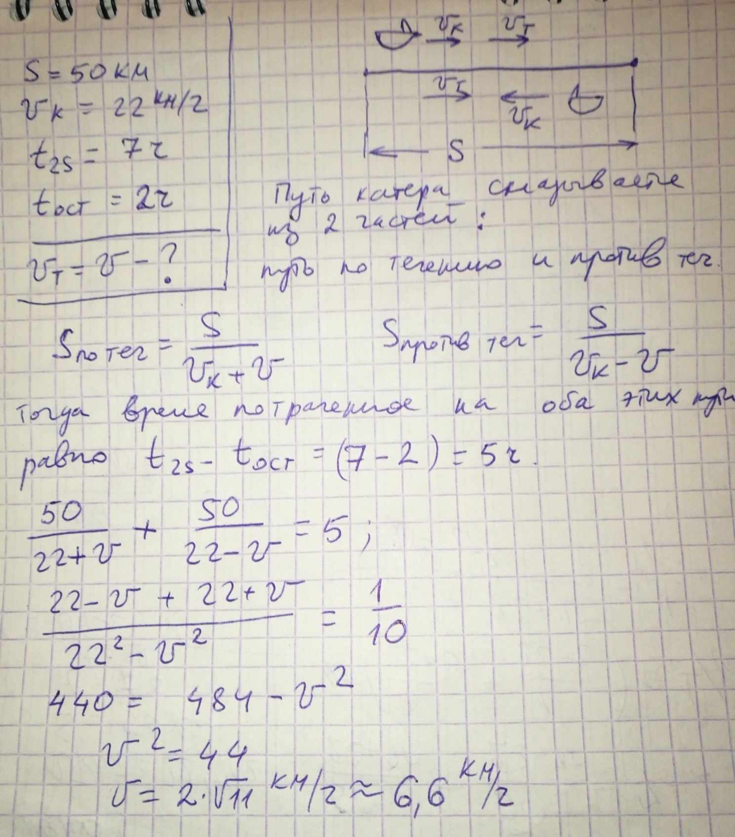 5. Расстояние между пристанями, равное 50 км, катер проходит туда и обратно за 7 ч, причем на остановки в пути он тратит 2 ч. Найдите скорость течения реки, если собственная скорость катера равна 22 км/ч.