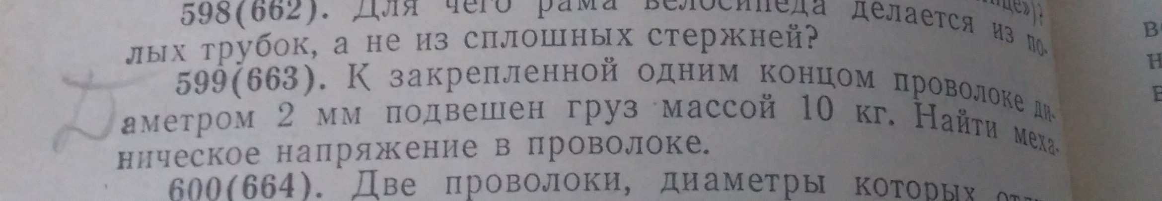 σ=(4mg)/ (π * d^2)=4*10*10 / 3.14*4*10^-6 = 0.318*10^8= 3.2*10^7 Па