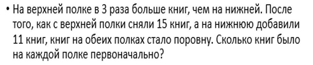 Пусть на нижней полке x книг. Тогда на верхней полке х * 3 Известно что когда с верхней полке сняли 15 книг а на нижнюю поставили 11 книг стало поровну книг. Состовляем уравнение.