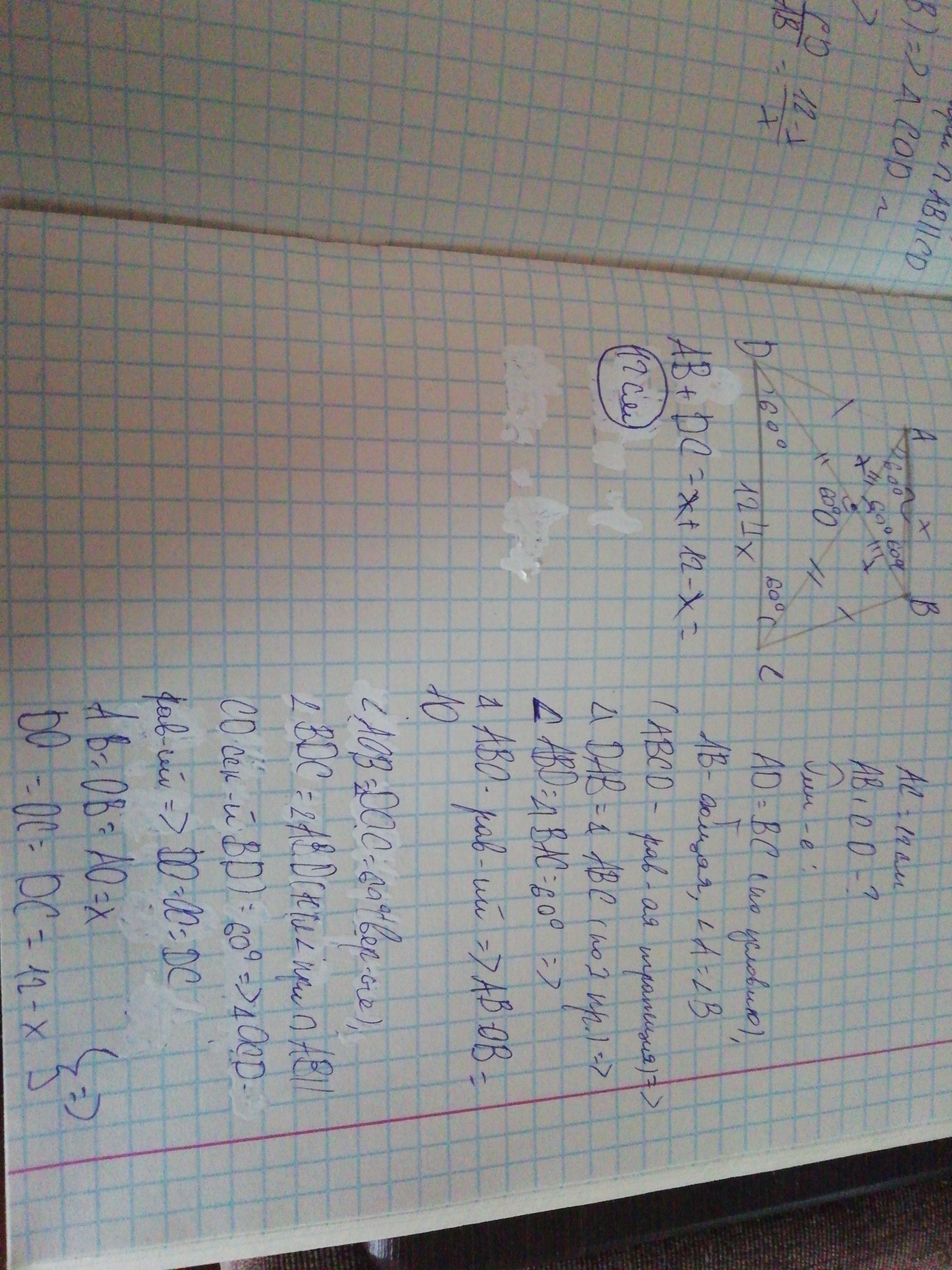 Диагонали в равнобедренный трапеции ABCD (AB || CD) пересекаются в точке О. Если АС=12см и угол АОВ=60°, найдите сумму длин основ трапеции.