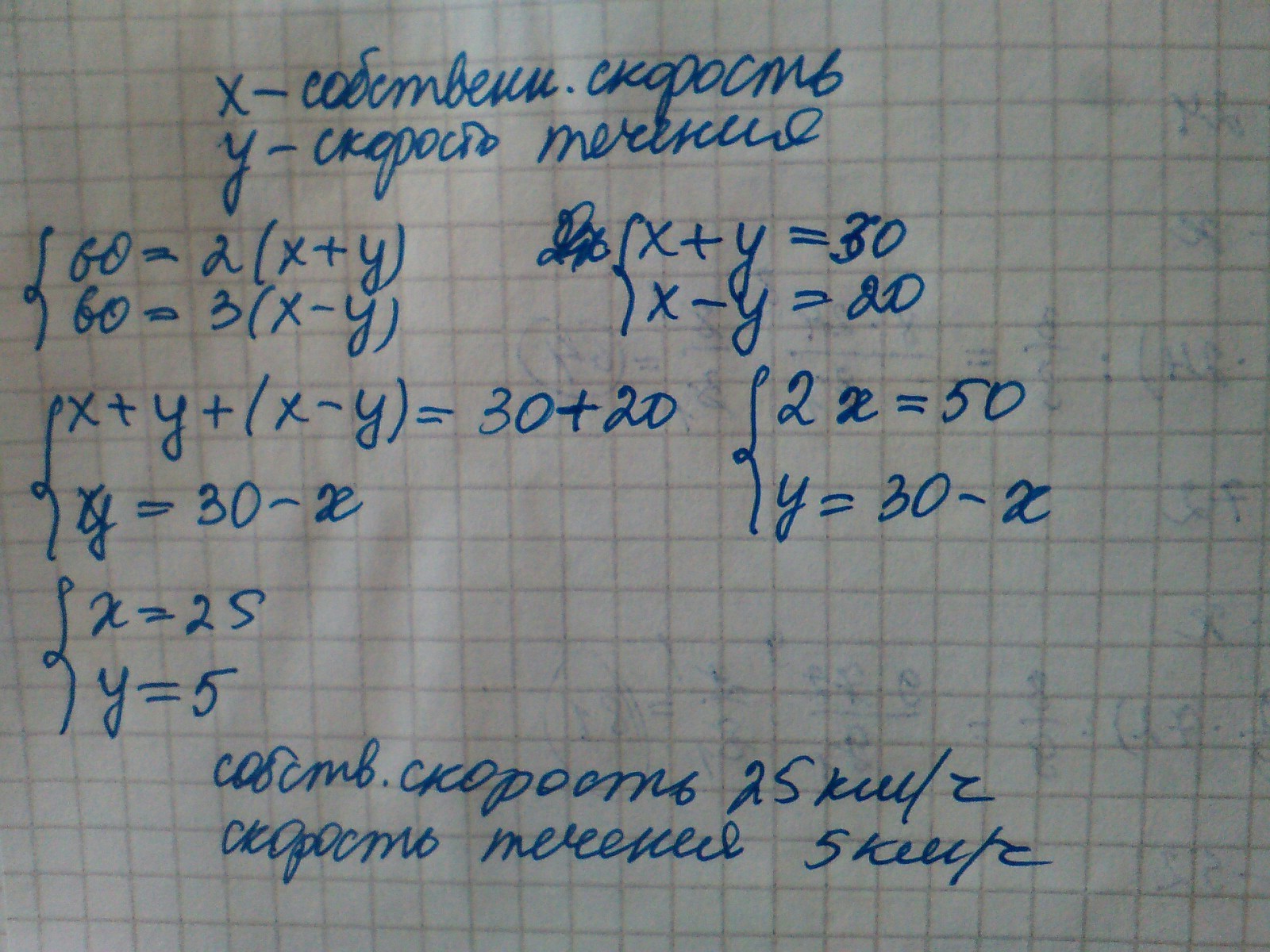 Расстояние между двумя туристическими базами по реке равно 60км.Это расстояние теплоход проплывает по течению реки за 2 часа,а против течения за 3 часа.Найди собственную склрость теплохода и скорость течения реки!