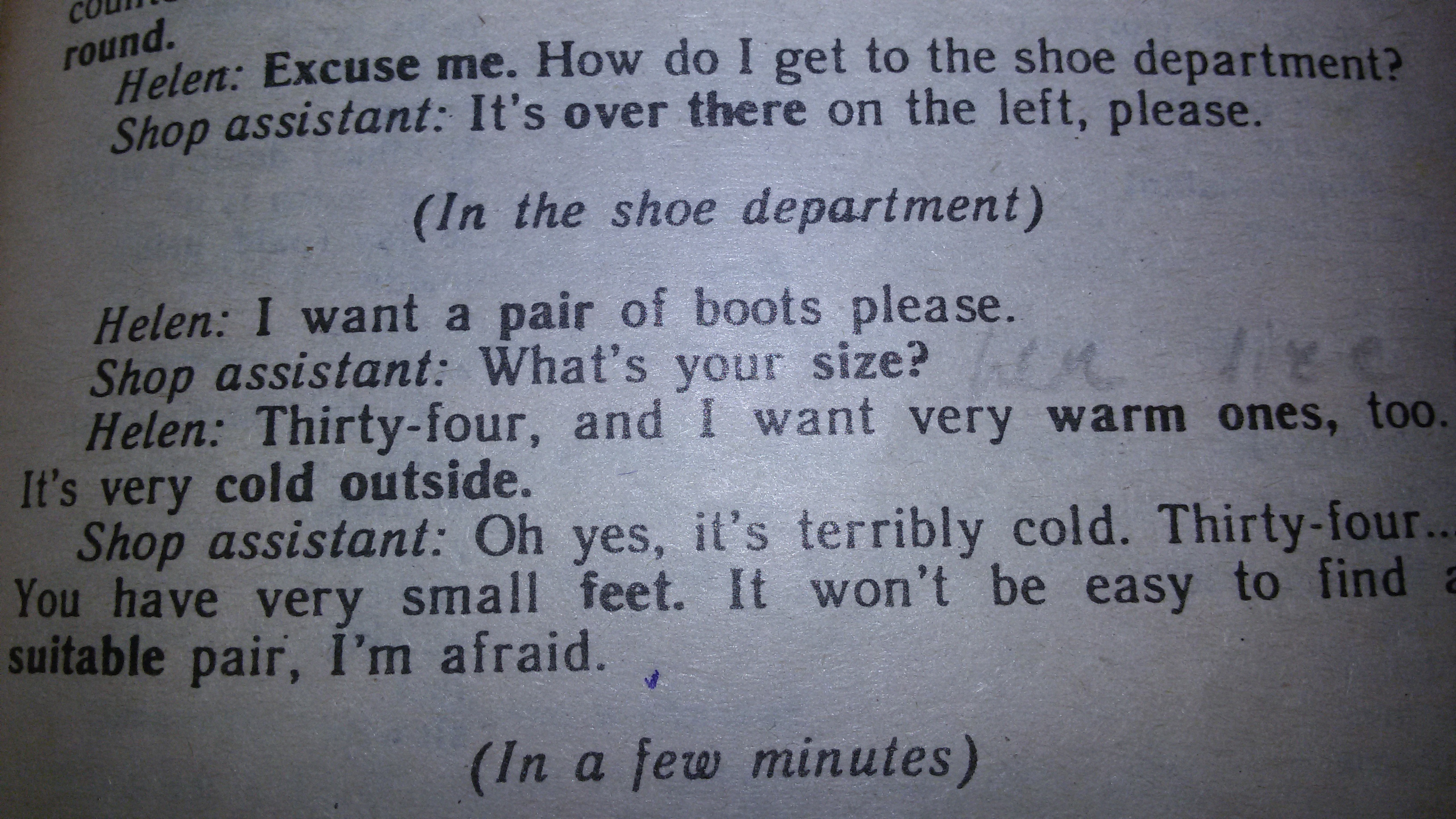 Shop assistant agreed that it was terribly cold and said that she had very small feet and it wouldn't be easy to find suitable pair.