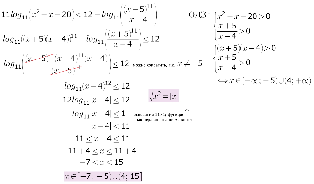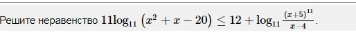 Решите неравенство 11log11(x^2+x−20)≤12+log11(x+5)^11/x−4.Вопрос дополнен картинкой.