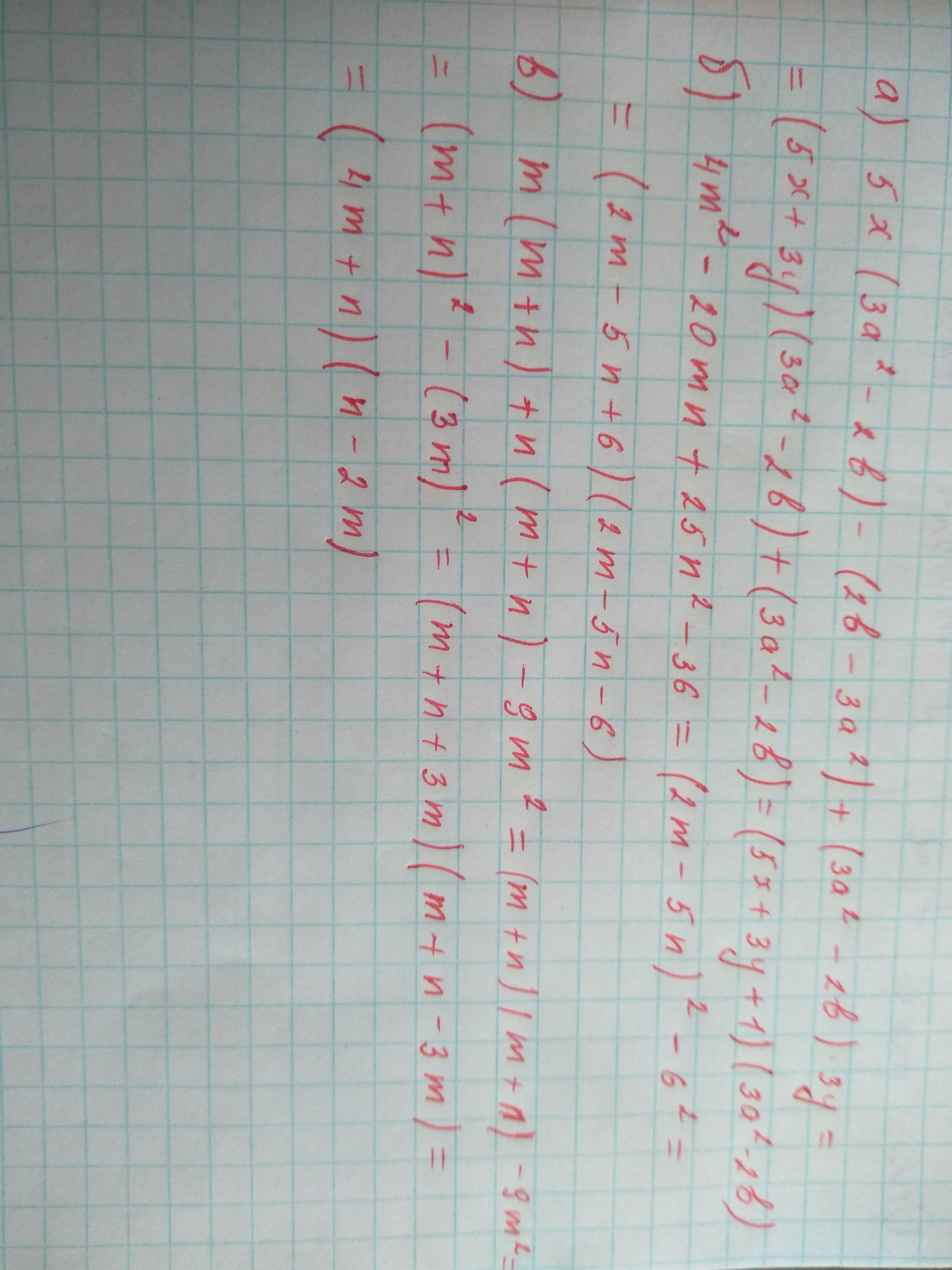 a) 5x(3a² - 2b) - (2b - 3a²) + (3a² - 2b)*3y = 5x(3a² - 2b) + (3a² - 2b) + 3y(3a² - 2b) = (3a² - 2b)(5x + 1 + 3y)