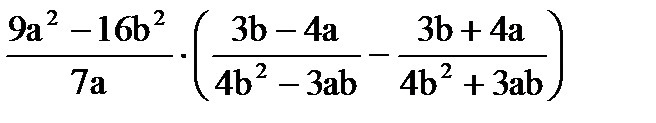 displaystyle tt frac{9a^{2}-16b^{2}}{7a}cdotbigg(frac{3b-4a}{4b^{2}-3ab}-frac{3b+4a}{4b^{2}+3ab}bigg)=\\\=frac{(3a-4b)(3a+4b)}{7a}cdotfrac{(3b-4a)(4b^{2}+3ab)-(3b+4a)(4b^{2}-3ab)}{b^{2}(4b-3a)(4b+3a)}=\\\=-frac{12b^{3}-16ab^{2}+9ab^{2}-12a^{2}b-12b^{3}-16ab^{2}+9ab^{2}+12a^{2}b}{7ab^{2}}=\\\=frac{14ab^{2}}{7ab^{2}}=2