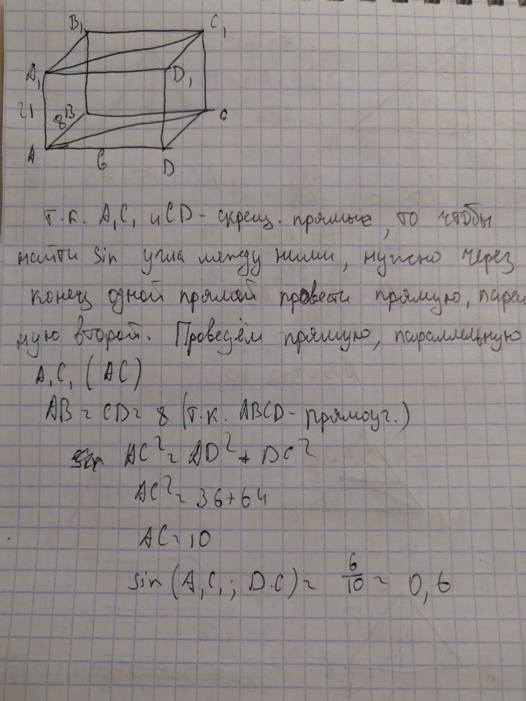 В прямоугольном параллелепипеде ABCDA1B1C1D1 известны длины рёбер AB = 8, AD = 6, AA1 = 21. Найдите синус угла между прямыми CD и A1C1.