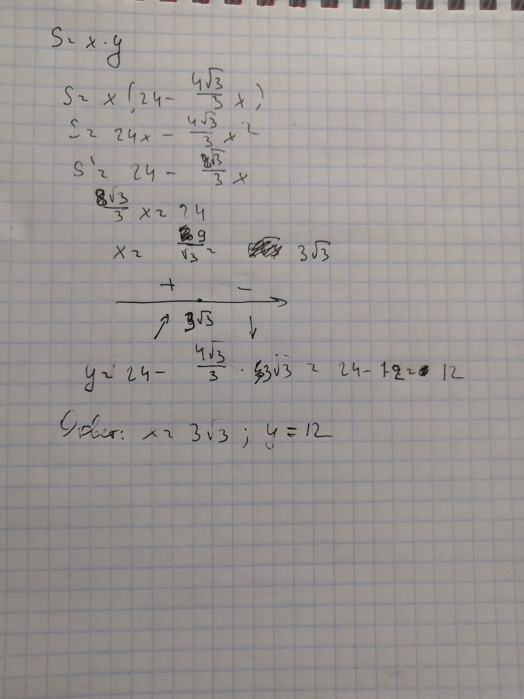 В прямоугольный треугольник, гипотенуза которого 24 см, а угол - 60°, вписан прямоугольник так, что его сторона лежит на гипотенузе. Найдите стороны прямоугольника, если известно, что он имеет наибольшую площадь.