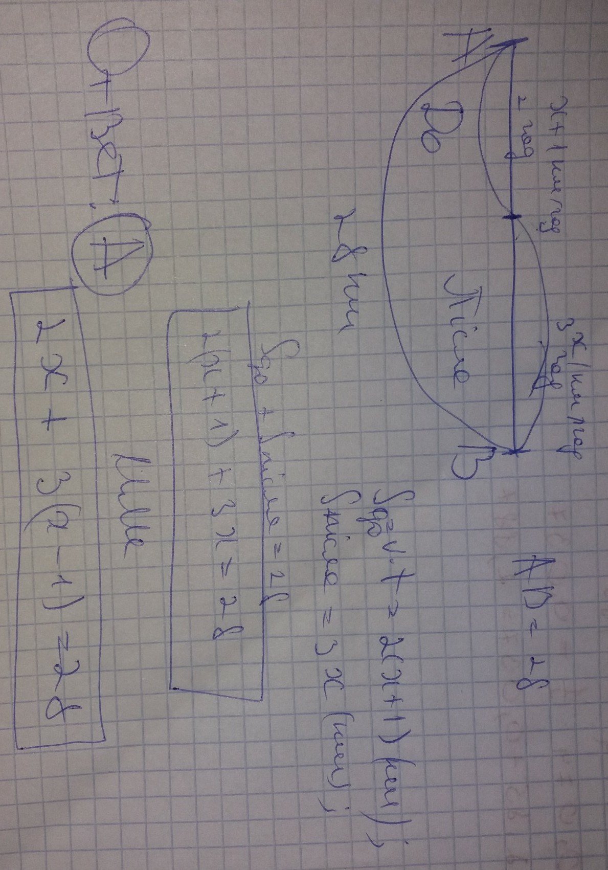 Б. рівняння 3х+2х=28, де х - швидкість туристів до привалу.