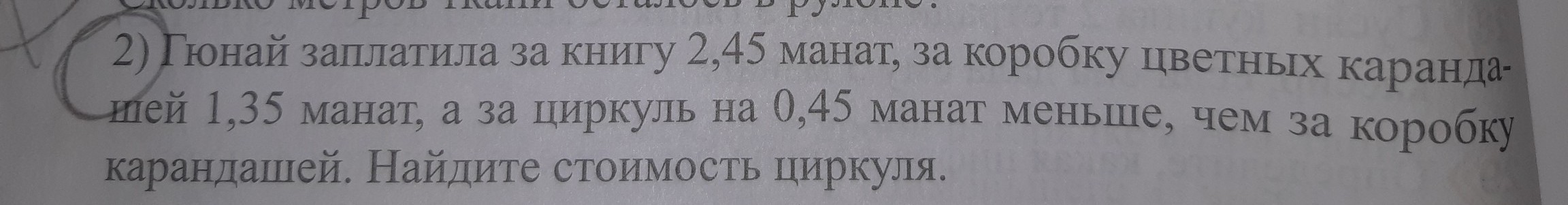 1,35 - 0,45 = 0,9 (манат) -- стоимость циркуля