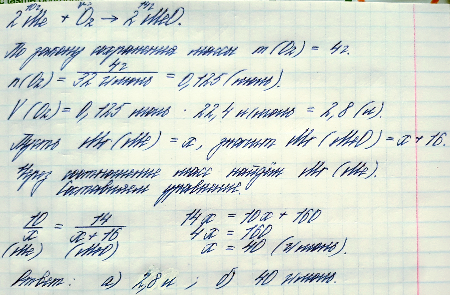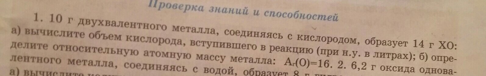 10 г двухвалентного металла, соединяясь с кислородом, образует 14 г XO: а) вычислите объем кислорода, вступившего в реакцию (при н.у. в литрах); б) определите относительную атомную массу металла: Ar(O) = 16.