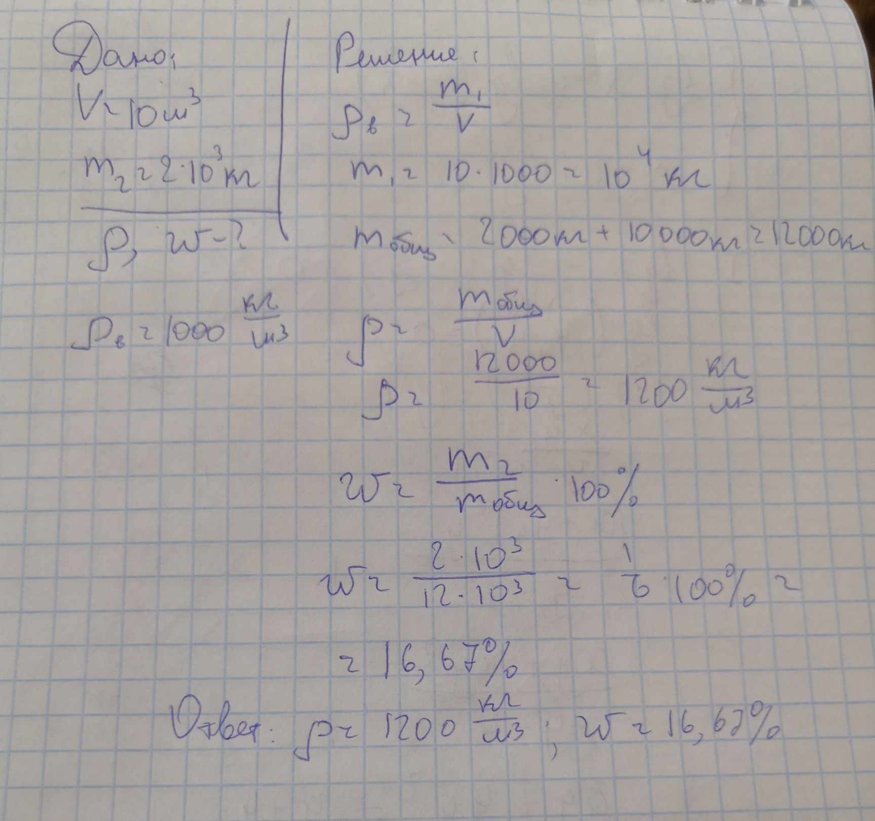 В ванну, содержащую 10 м3 воды, засыпали 2 т поваренной соли. Под-ученный раствор тщательно перемешали. Определите плотность и концентрацию полученного раствора
