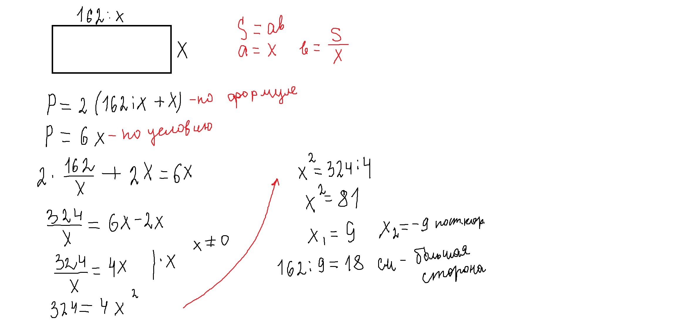 решение задачи смотри внизу.Обозначим меньшую сторону-Х,тогда вторая сторона S:X=162:X.Запишем периметр применяя формулу Р=2(а+в) и по условию Р=6Х.Т.к это один и тот же периметр-приравняем их и решим уравнение,раскрыв скобки.