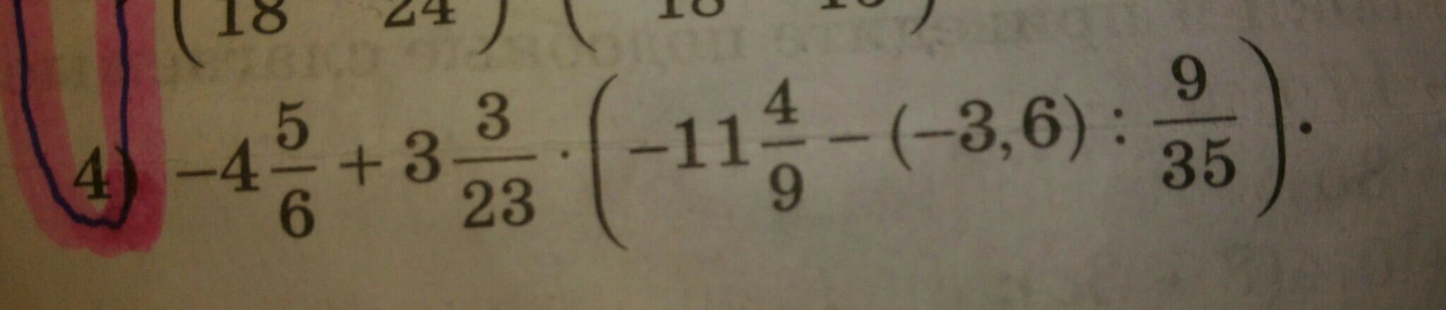 -4 5/6+3 3/23*(-11 4/9-(-3,6):9/35)= 3 1/6